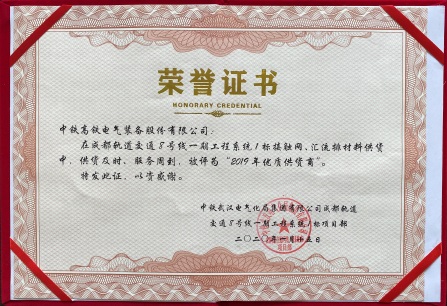 公司被中鐵武漢電氣化局成都軌道交通8號(hào)線一期工程系統(tǒng)1標(biāo)項(xiàng)目部評(píng)為“2019年優(yōu)質(zhì)供貨商”