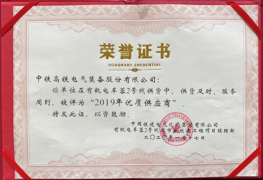 公司被中鐵建電氣化局有軌電車蓉2號(hào)線及市政改造工程項(xiàng)目經(jīng)理部評(píng)為“2019年優(yōu)質(zhì)供應(yīng)商”